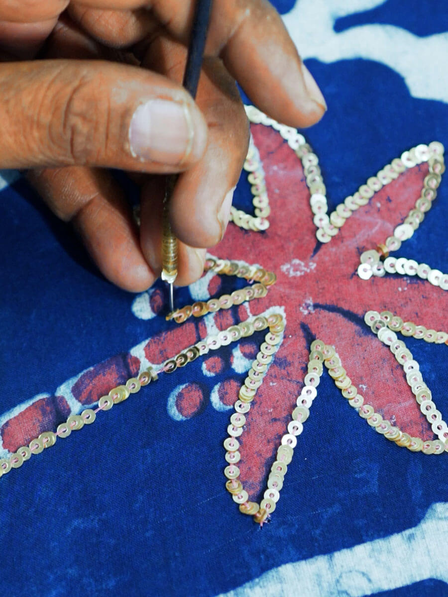 - Rich brick red and indigo palette; slight color variation is natural in handcrafts