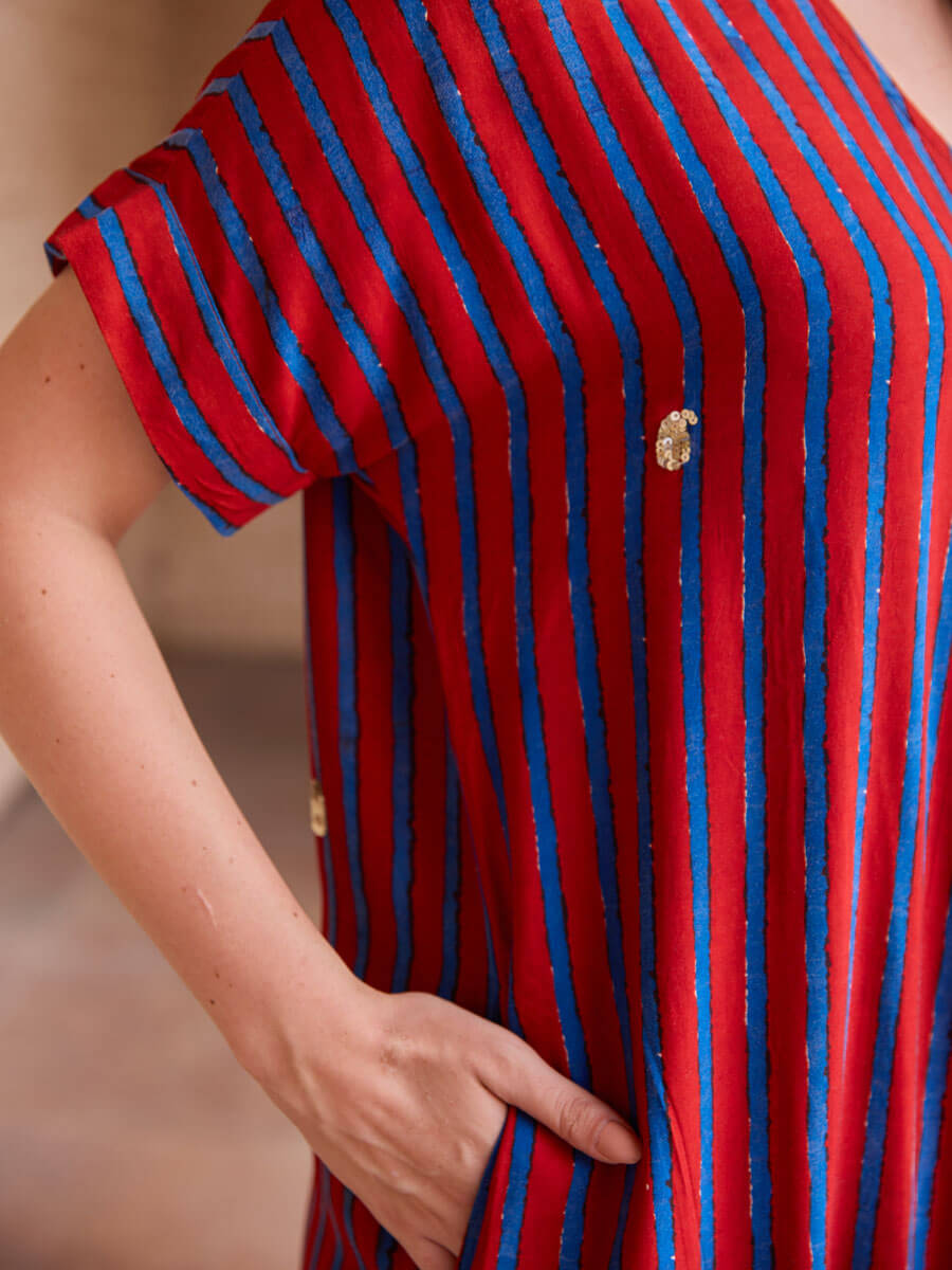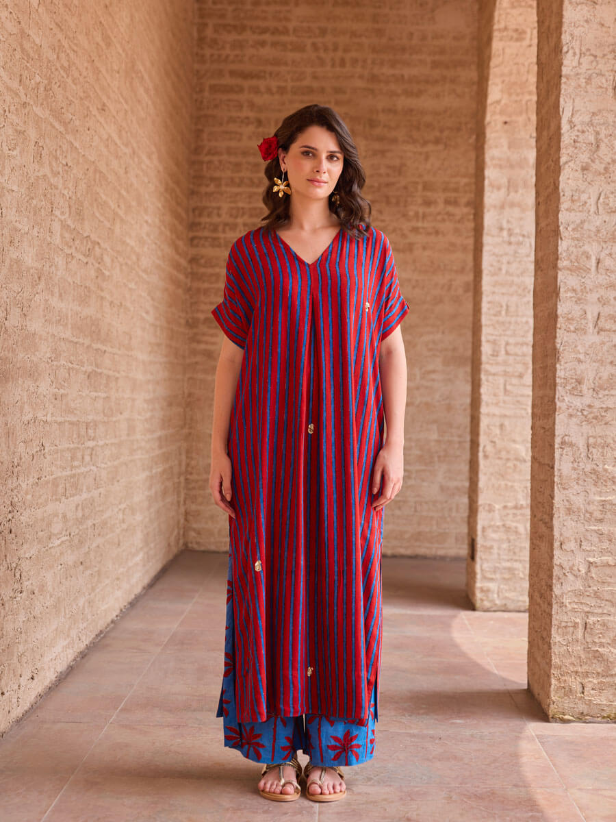 - Rich brick red and indigo palette; slight color variation is natural in handcrafts