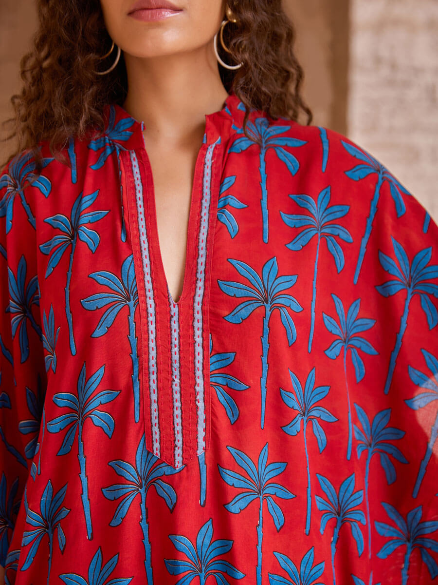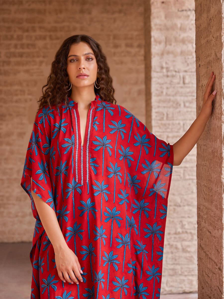 • Kaftan features a kantha-embroidered mandarin neckline for everyday chic