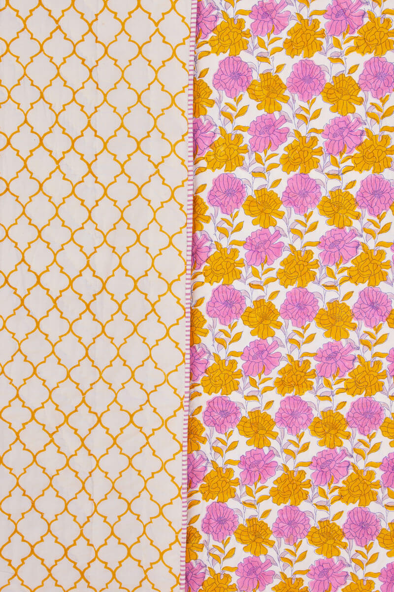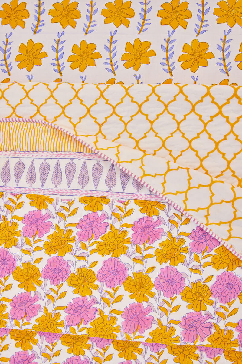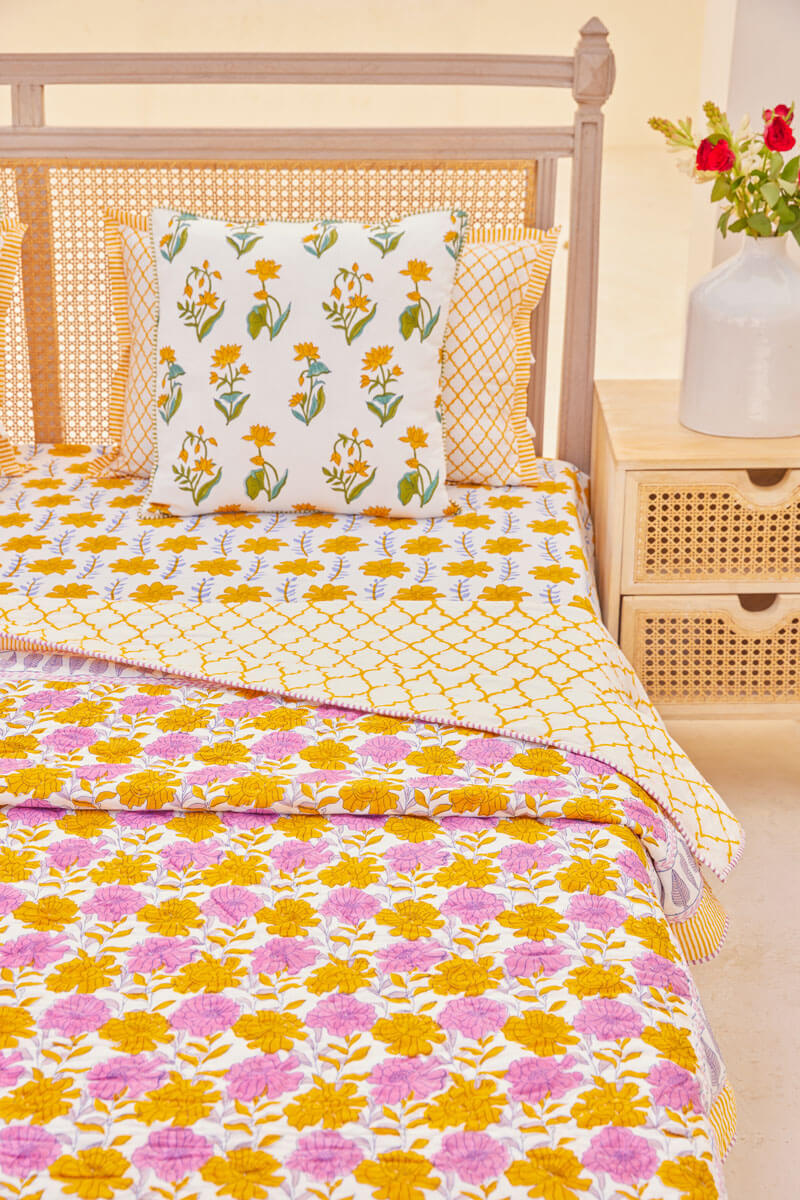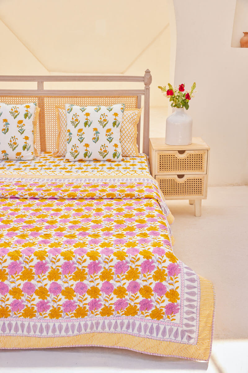 This quilt is pre-washed and ready to useAir the quilt first time before useDry cleaning recommended for increased lifeWash in cold water using a mild detergentDo not soak, spin, wring, or tumble dryDry in shade on a flat surfaceComes in a fabric care bag. Store when not in use.