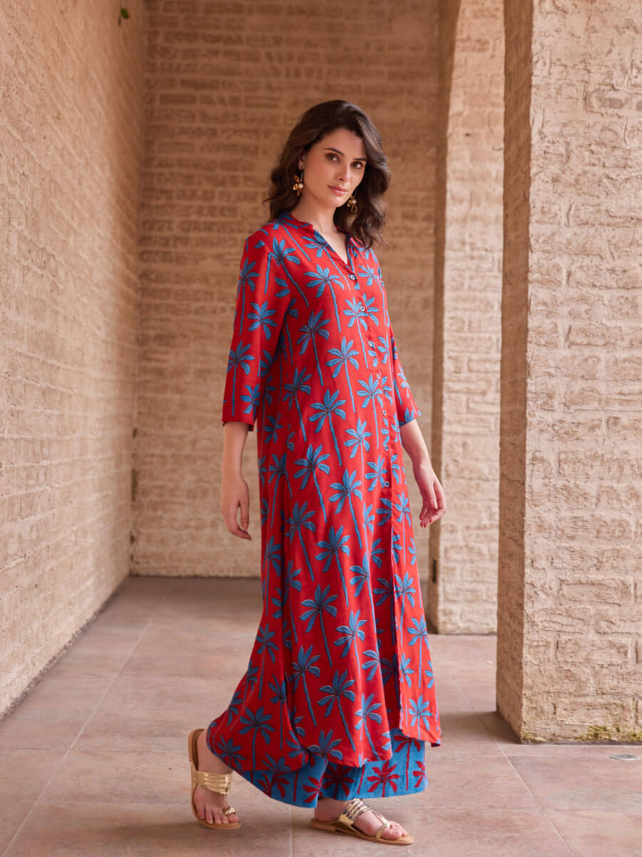 • Regular-fit A-line modal kurta handcrafted using Bagru dyeing technique