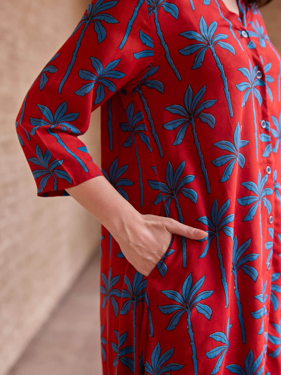 • Rich brick red and indigo palette; slight color variation is natural in handcrafts